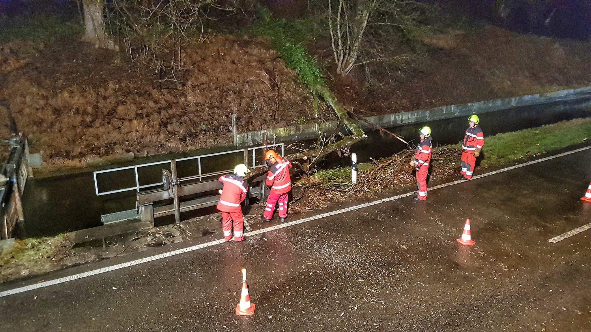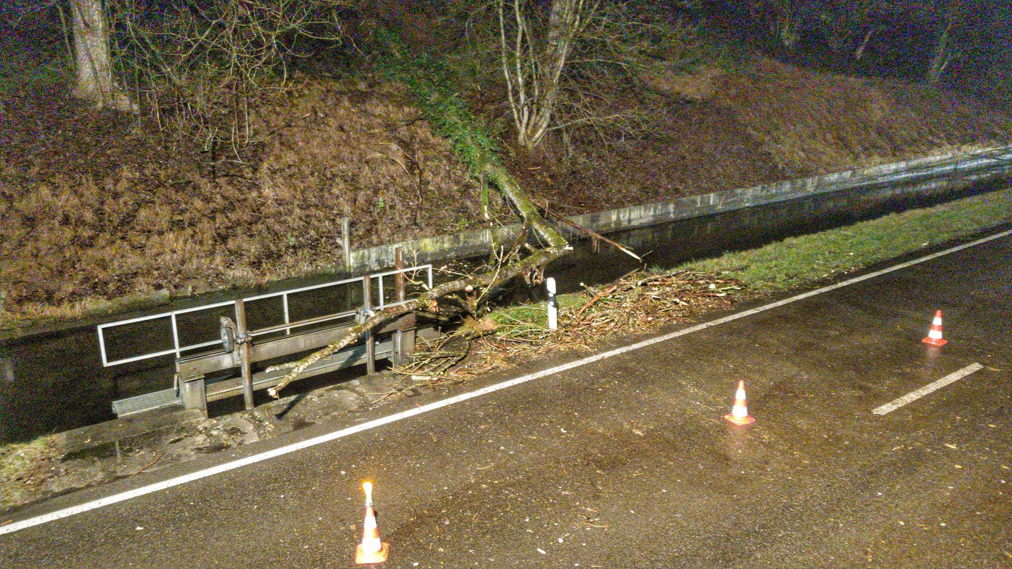 Glücklicherweise gab es nur einen kleinen Blechschaden und keine Verletzten. Wir befreiten die Fahrbahn von den Ästen und richteten eine wechselseitige Verkehrsführung ein. Ein Teil vom Baumstamm mussten wir mit der Motorsäge entfernen, weil er in die Fahrbahn ragte. Bereits nach kurzer Zeit konnten wir die Strasse wieder räumen und vollständig für den Verkehr freigeben.