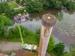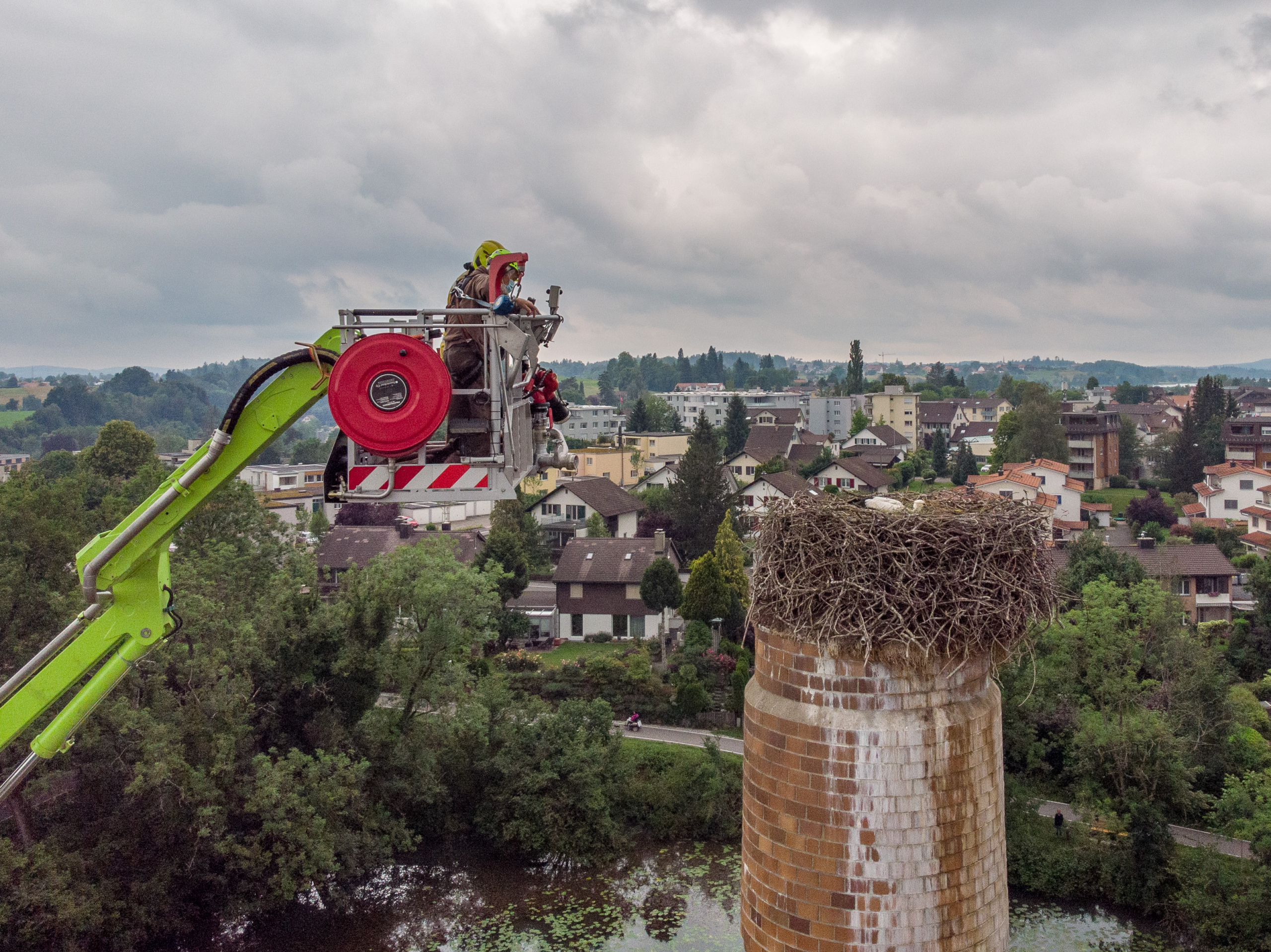 Praktisch jedes Jahr sitzt auf dem Schönkamin in Wetzikon ein Storchenpaar und brüten ihre Eier aus. Auch dieses Jahr wuchs wieder ein Jungstorch heran. Diese Jungstörche werden beringt, bevor sie das Nest verlassen. Diese Arbeit unterstützen wir jeweils mit unserem Hubretter, weil das Nest mit einer normalen Leiter nicht erreichbar ist. So stieg am Mittwochvormittag der Hubretter mit Max Zumbühl zum Storchennest auf und beringen den Jungstorch. Der Jungstorch wird demnächst das Nest verlassen.