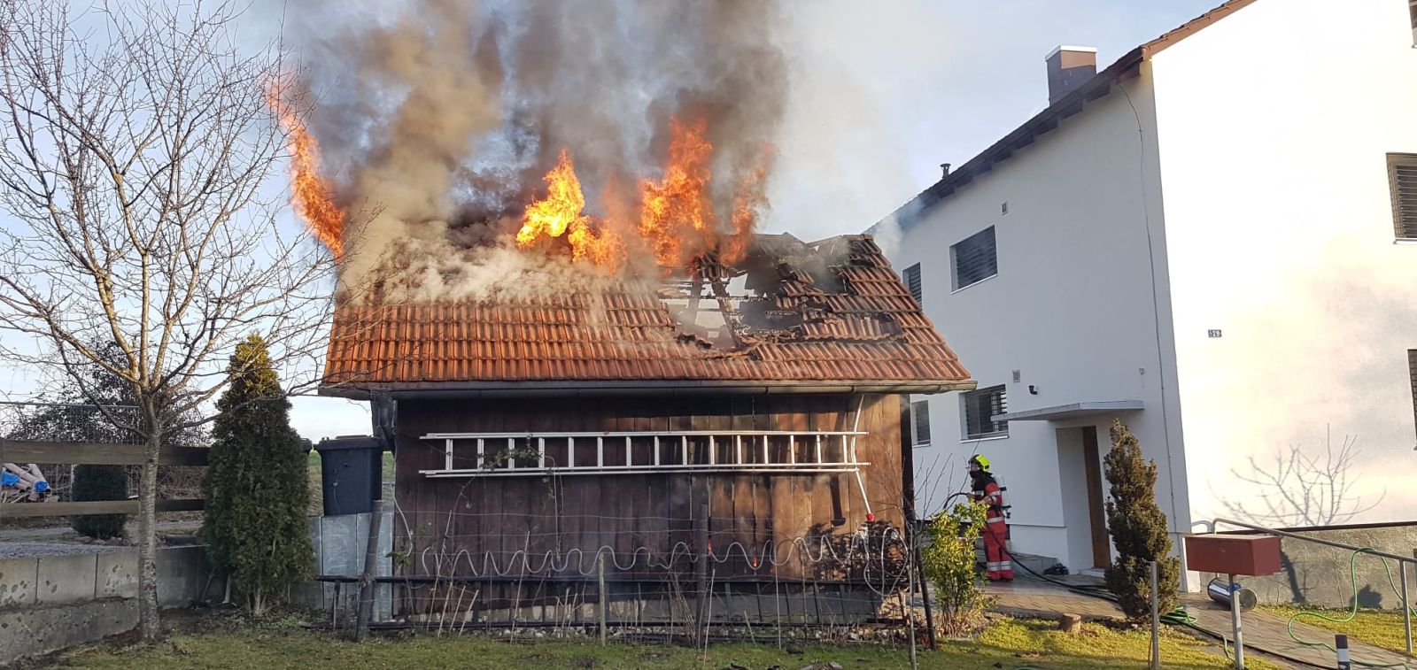 Die Feuerwehr Wetzikon-Seegräben wurde am Samstag um 16:30 Uhr wegen einem Brand an der Aathalstrasse in Seegräben alarmiert. Vor Ort trafen die Einsatzkräfte auf einen in Vollbrand stehenden Schopf. Dank einem raschen Eingreifen konnte ein Übergriff auf das naheliegende Wohnhaus vermieden und das Feuer schnell gelöscht werden. Durch das Feuer wurde die Statik der Dachkonstruktion in Mitleidenschaft gezogen. Wegen dem bevorstehenden Sturm am Montag wurde die Dachkonstruktion von der Feuerwehr entfernt, damit keine Personen durch herunterfliegende Teile gefährdet werden.