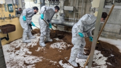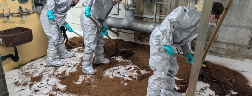 Mit entsprechender Schutzausrüstung wurde der Wasser-Ölbinder grossflächig aufgebracht, mit der ausgelaufenen Flüssigkeit vermischt und anschliessend in Container geschaufelt. Das gebundene Material wurde fachgerecht entsorgt. Der Einsatz dauerte insgesamt rund fünf Stunden.