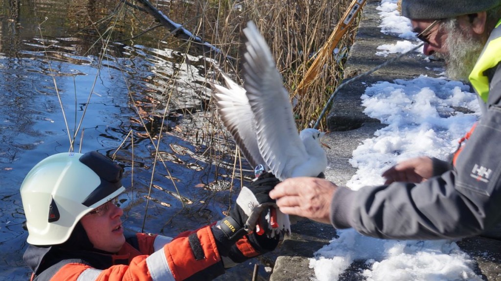 Ein Feuerwehrmann mit Fischerstiefel und an einem Seil gesichert rettete daraufhin die Möwe. An Land musste zusammen mit dem Tier-Rettungsdienst der mehrmals um den Flügel gewickelte Silch entfernt werden. Nach einem kurzen Untersuch konnte die Möwe freigelassen werden. Sofort flog sie davon und suche das Weite.