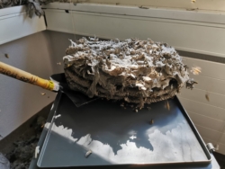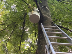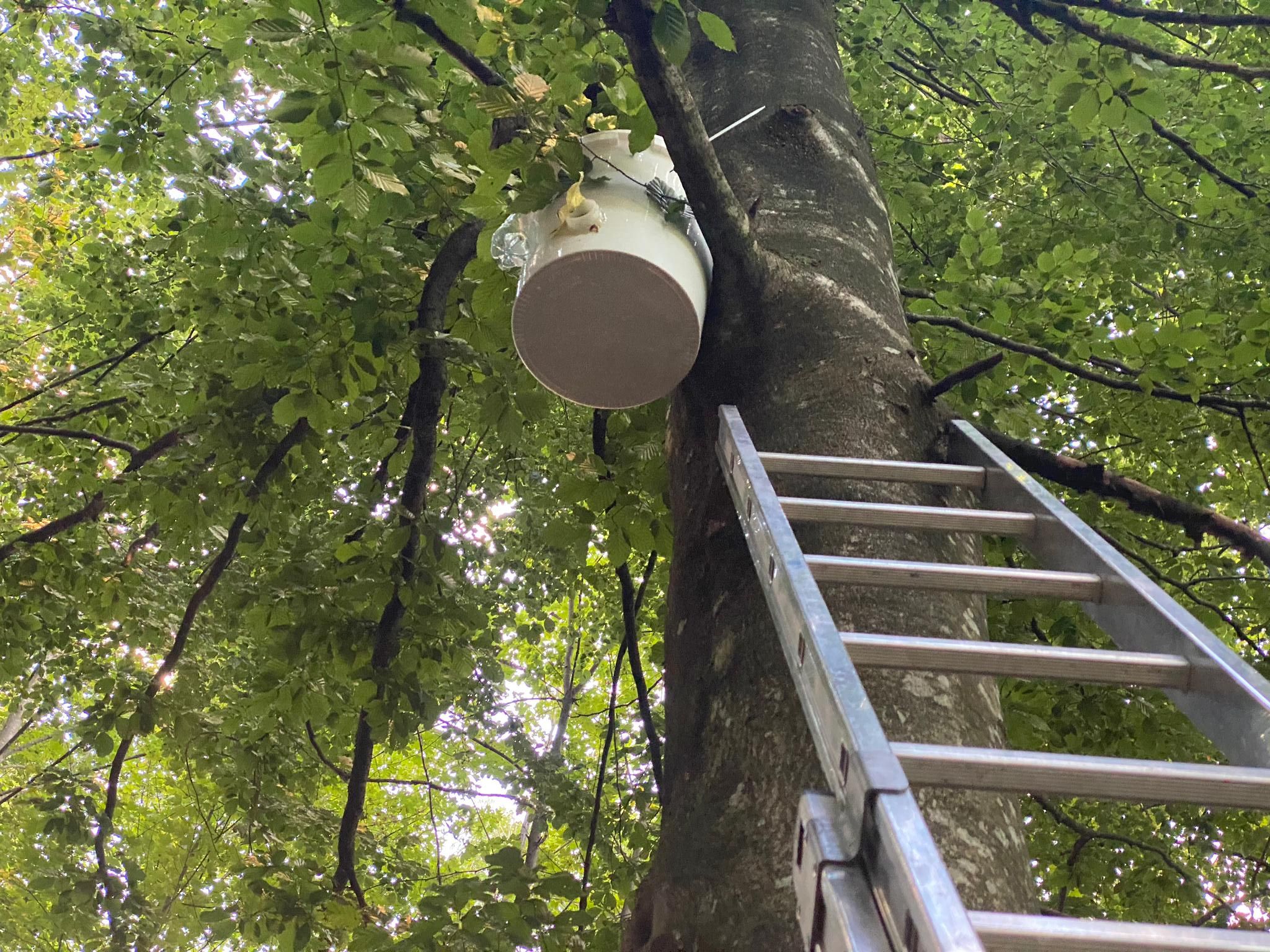 Unsere Wespen-Spezialisten fällt dieser Schritt schwer und deshalb haben sie die Möglichkeit der Umsiedlung vertieft geprüft. Letzte Woche bot sich nun die Gelegenheit ein Wespennest umzusiedeln. Das Nest befand sich in einem Gewerbegebäude in der Zwischendecke. Unzählig Wespen gelangten so in die Räumlichkeiten und liessen ein Arbeiten nicht mehr zu. Obwohl das Wespennest sehr gross war, entschlossen sich die Wespenspezialisten das Nest umzusiedeln. Ganz einfach liess sich das Nest nicht von der Decke lösen. Dabei wurden beide Spezialisten trotz Schutzausrüstung von den Wespen je einmal gestochen. Das hinderte sie aber nicht die Arbeit weiter zu führen. Das entfernte Wespennest wurde danach in einem präparierten Kunststoffeimer untergebracht. Dort wurde er für eine Nacht gelassen und am darauffolgenden Tag in ein Waldstück in Wetzikon umgesiedelt. Dort hängt nun das Wespennest an einem Baum. Ein Augenschein ein paar Tage später war sehr erfreulich. Um das Nest herrscht reger Flugverkehr der Wespen. Die Umsiedlung war somit erfolgreich.